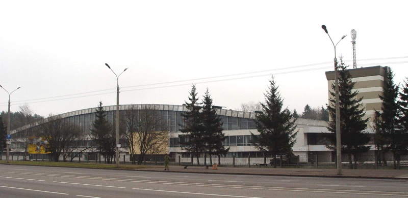 Здание легкоатлетического манежа в микрорайоне.